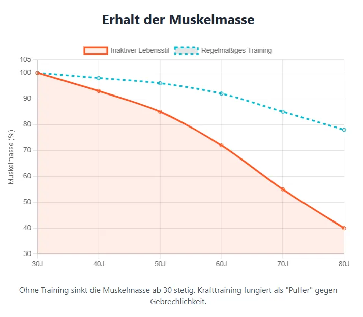 Reicht Spazierengehen aus?Spazierengehen ist gesund, ersetzt aber kein Krafttraining. Für Muskelerhalt sind gezielte Belastungsreize notwendig.
